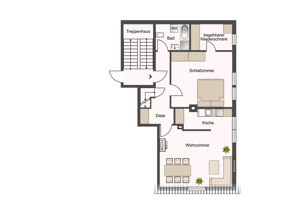 Das Schlafzimmer bietet rund 16 m² Wohnfläche und verfügt zusätzlich über ein separa-tes Ankleidezimmer. Das Tageslichtbad ist mit einer Dusche, einer Badewanne sowie einem Waschmaschinenanschluss ausgestattet.