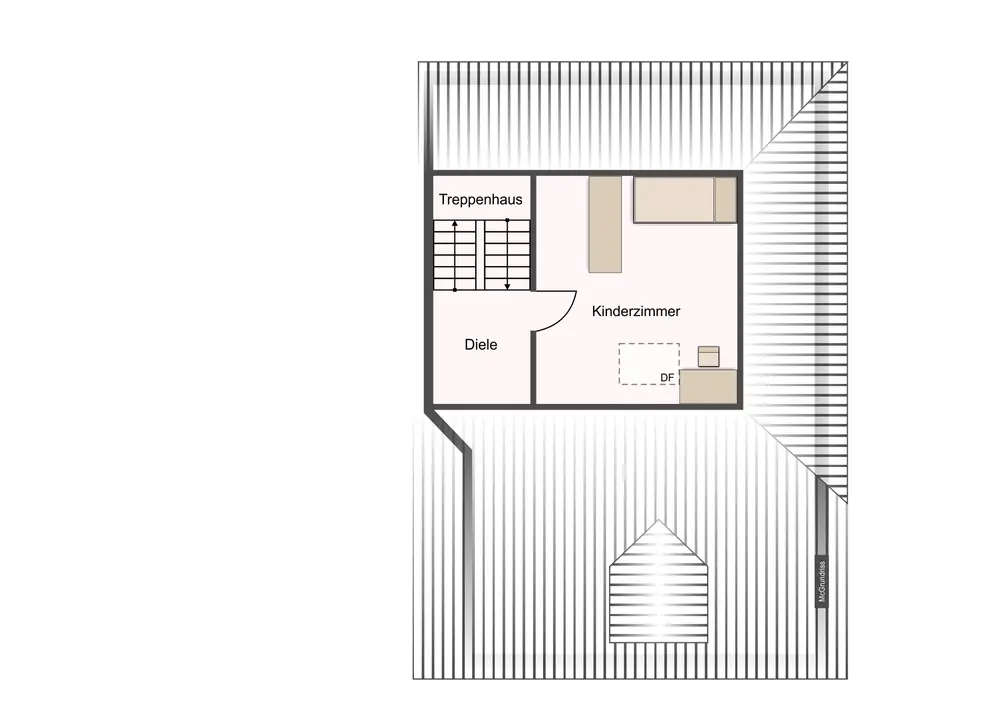 Über eine stilvolle Wendeltreppe gelangt man in das obere Geschoss der Wohnung, das sich flexibel als Wohn- oder Schlafbereich nutzen lässt. In der gesamten Wohnung sind bereits doppelt verglaste Kunststofffenster verbaut. Im Bad und im Dachgeschoss wurden die Roto-Dachfenster im Rahmen der Renovierung erneuert. Auch die Bodenbeläge wurden weitgehend durch neue Laminatböden ersetzt.