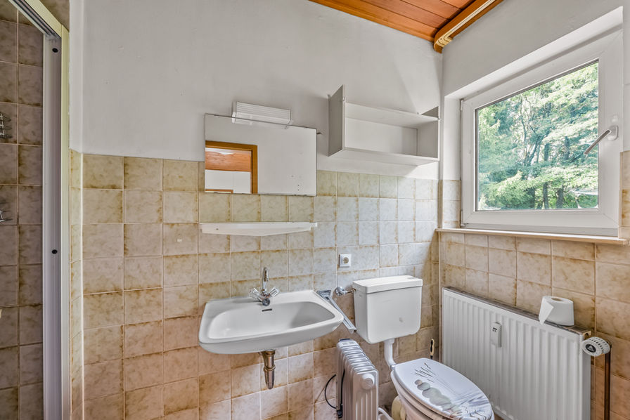 Das zweite Wohngebäude auf dem Grundstück ist ein Zweifamilienhaus, das sich in zwei nahezu identische Wohneinheiten aufteilt. Das Erdgeschoss mit ca. 96 m² steht aktuell leer und kann mit überschaubarem Renovierungsaufwand kurzfristig vermietet werden. Das Obergeschoss ist derzeit an eine alleinstehende Dame für 400 Euro kalt vermietet und umfasst 95 m². Die Versorgung des Zweifamilienhauses erfolgt ebenfalls über eine separate Ölheizung aus dem Jahr 1986.
