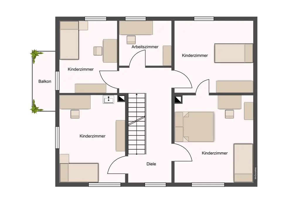 Im Obergeschoss erwarten Sie fünf weitere Zimmer mit durchdachtem Grundriss, ideal als Schlaf-, Kinder- oder Arbeitszimmer nutzbar. Von einem der Zimmer aus betreten Sie den Balkon, der einen schönen Blick in die umliegende Landschaft bietet.