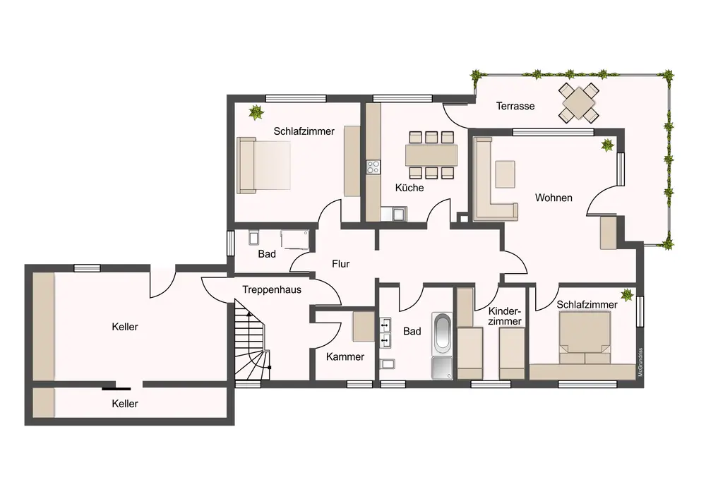Über das zentrale Treppenhaus gelangen Sie in das Gartengeschoss des Hauses, das eine Wohnfläche von rund 120 m² bietet. Die Wohnung umfasst insgesamt vier Zimmer, darunter drei Schlafzimmer, ein Wohnzimmer, eine Küche sowie zwei separate Badezimmer. Das Highlight dieser Etage ist zweifellos der großzügige Wohnbereich mit ca. 28 m² Fläche und einer weitläufigen Panoramafensterfront. Von hier aus haben Sie direkten Zugang zur Terrasse und in den liebevoll gepflegten Garten. Die Küche misst etwa 17 m² und wurde erst 2012 eingebaut, befindet sich daher in einem hervorragenden Zustand. Die Raumaufteilung des Badezimmers ähnelt der im Erdgeschoss und bietet somit ebenfalls viel Komfort.